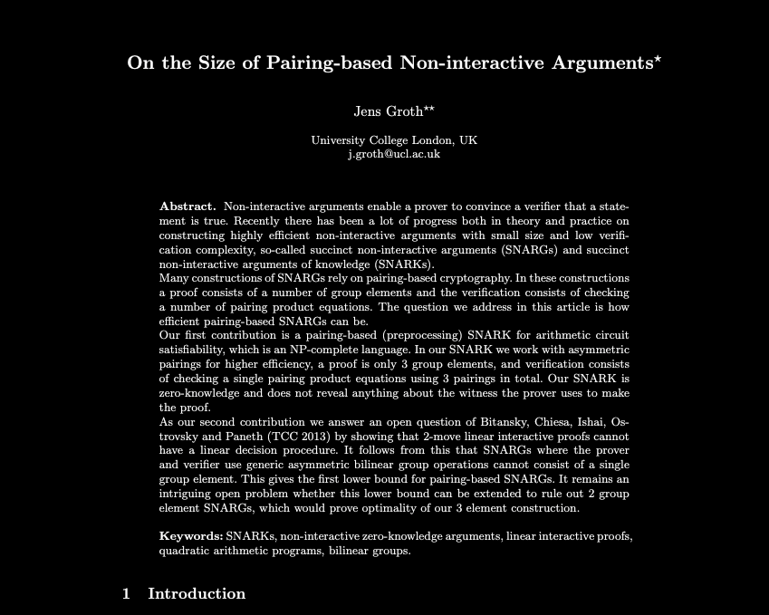 Groth16 zkSNARK in Rust from scratch: R1CS, QAP, trusted setup, proof generation, and verification — based on Groth16 (ePrint 2016/260).